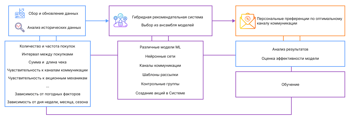 - После выбора оптимальной модели система обучается на полученных данных, что позволяет повышать точность предложений в будущем.