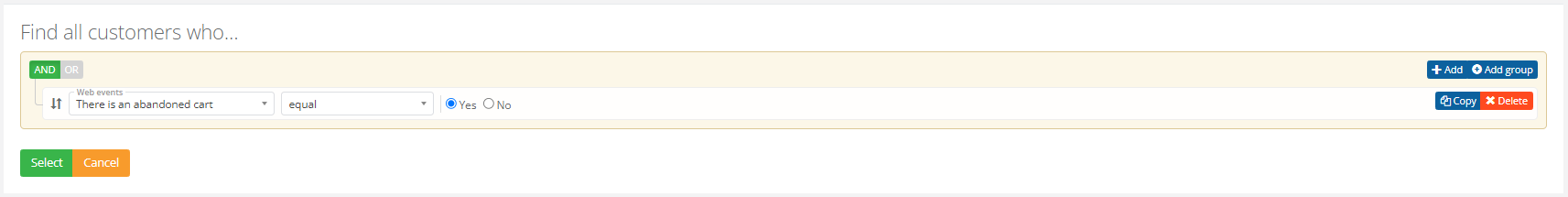 The Segment Builder allows to find all customers with or without an abandoned cart. A special condition (there is an abandoned cart) is used for this purpose.