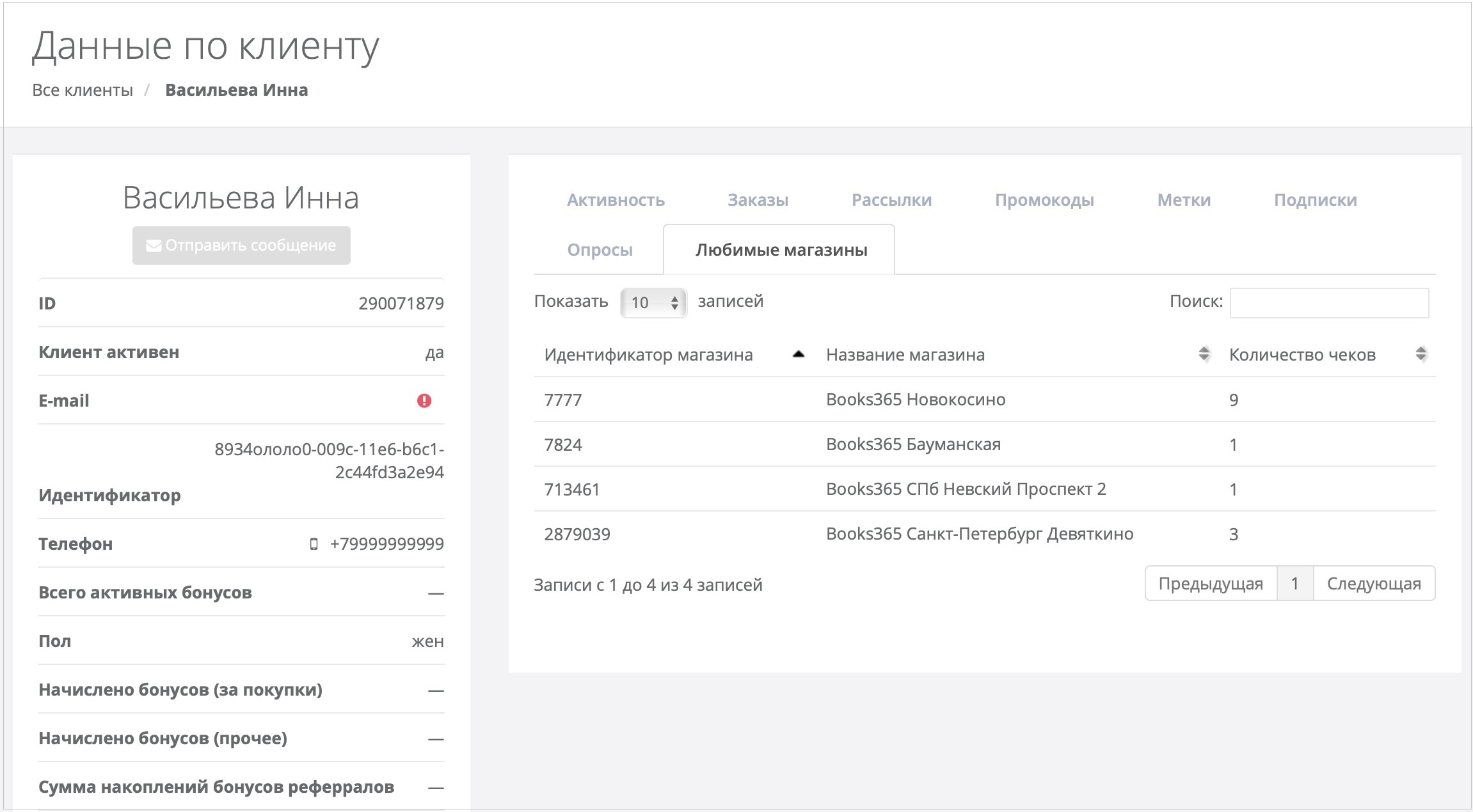 Любимые магазиныЭто дополнительная функциональность, доступная по запросу. В блоке Любимые магазины выводится информация о магазинах, где клиент совершал покупки. Для каждого магазина выводится: