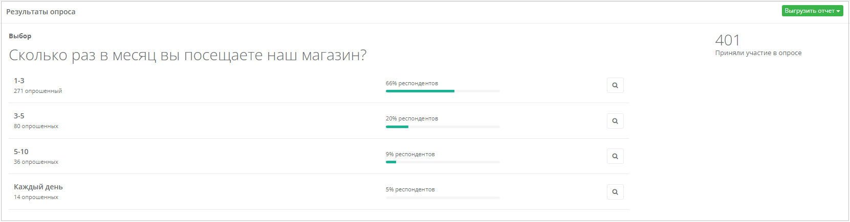• Рядом с каждым вариантом — значок (icon_info.png) для загрузки списка клиентов, выбравших данный вариант. Если в опросе несколько вопросов, то их результаты выводятся сгруппированными по вопросу один под другим.