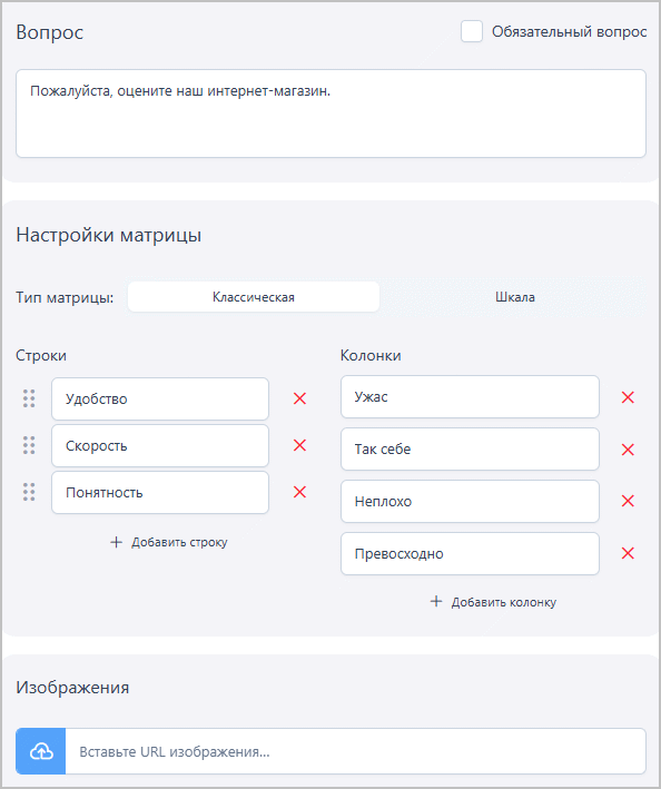 При выборе режима Матрица можно задать несколько критериев для оценки. Данный режим аналогичен вопросу-матрице (Шкала).