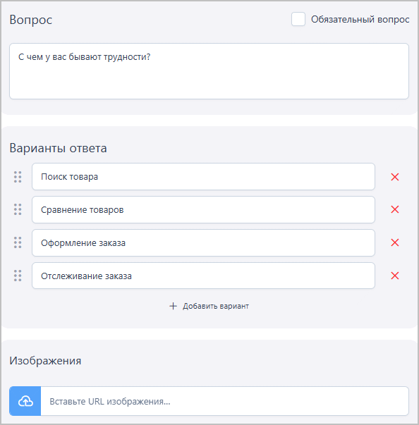 Чтобы добавить вариант ответа, нажмите + Добавить вариант. Чтобы удалить вариант ответа, нажмите значок удаления (icon_delete.png) справа от требуемого варианта. Чтобы изменить порядок вариантов, перетаскивайте их, нажав и удерживая значок (icon_drag.png) слева.
