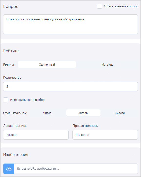 При выборе режима Одиночный клиенту будет предложено дать оценку по одному критерию, сформулированному в самом вопросе. Опционально можно задать подписи для крайнего левого и крайнего правого элементов шкалы, чтобы пояснить для клиента логику оценки.