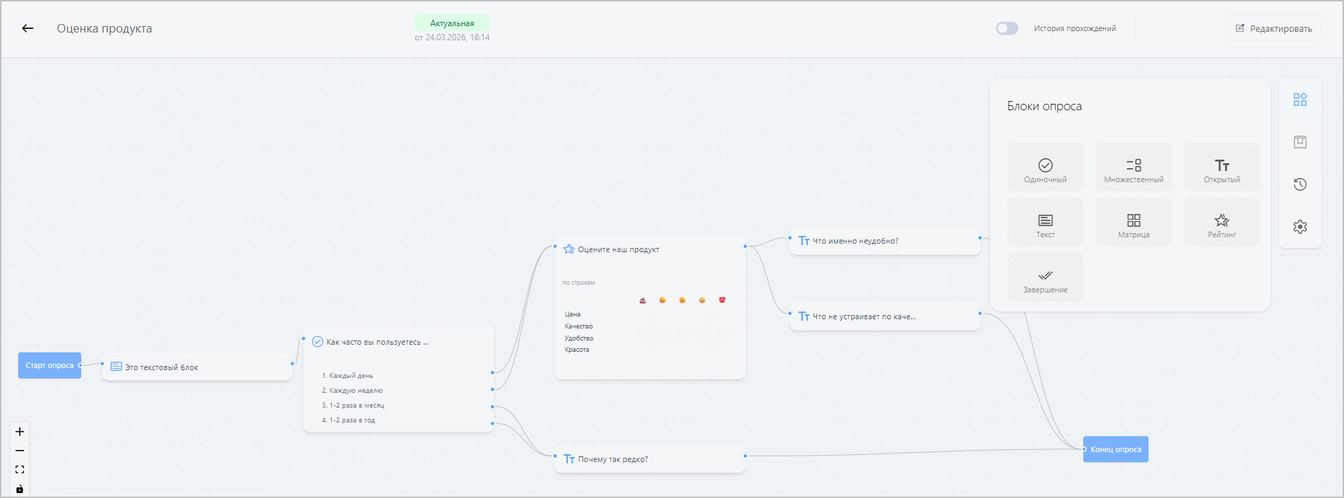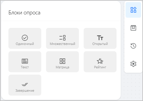 Чтобы добавить вопрос, выберите на панели инструментов справа Блоки опроса и перетащите блок требуемого типа в основную область опроса. Описание доступных типов вопросов приведено ниже. Вы также можете добавить текстовый блок или блок завершения опроса — например, для опросов с большим количеством ветвлений, чтобы избежать необходимости тянуть связи от каждой ветви к одному блоку завершения.