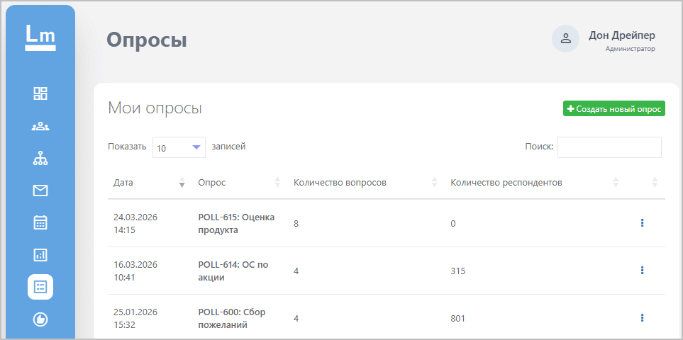 Список всех созданных опросов можно посмотреть в разделе основного меню Опросы. Для каждого опроса отображаются следующие параметры: