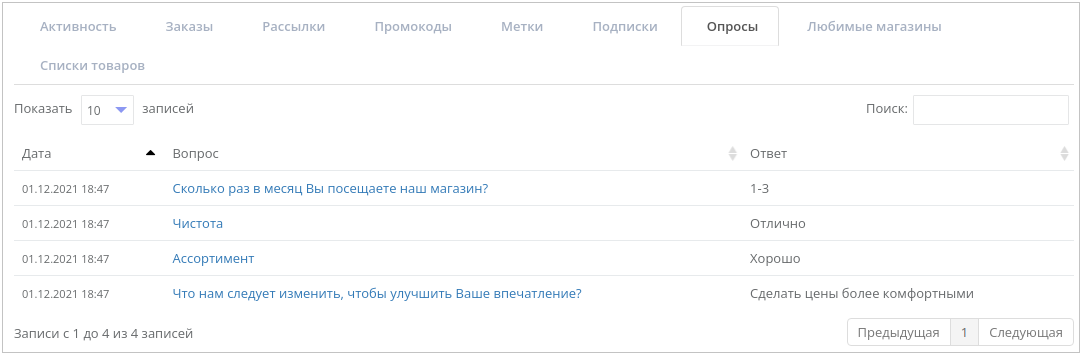 В профиле клиента во вкладке Опросы доступна информация об отправленных клиенту опросах и о том, как клиент ответил на каждый из вопросов: