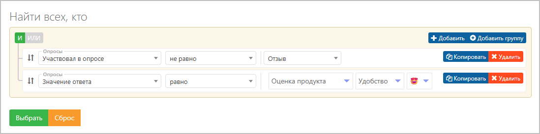 В данном примере в выборку войдут клиенты, которые не проходили опрос "Отзыв", но участвовали в опросе "Оценка продукта" и поставили высокую оценку по критерию удобства.