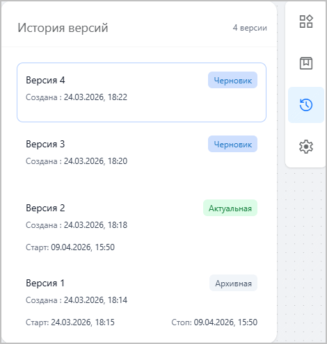 Для каждой версии отображается дата создания. Для актуальной и архивных версий также отображается дата старта (перевода в статус актуальной), а для архивных версий — ещё и дата остановки (перевода в статус архивной).
