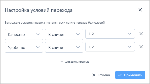 Все условия объединяются логическим оператором ИЛИ. На изображении справа показан пример настройки условий перехода от вопроса-матрицы или рейтинга: клиент перейдет по данной связи, если он поставил низкую оценку по критерию качества или по критерию удобства.